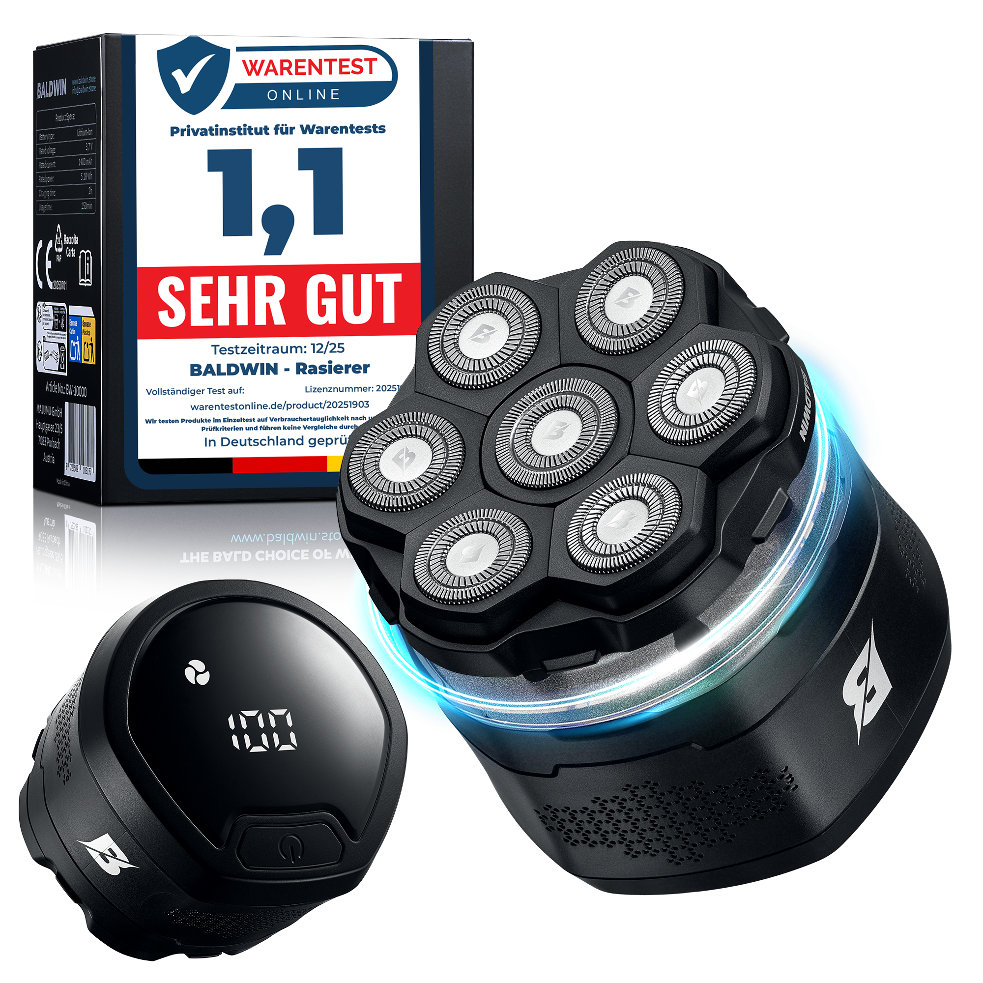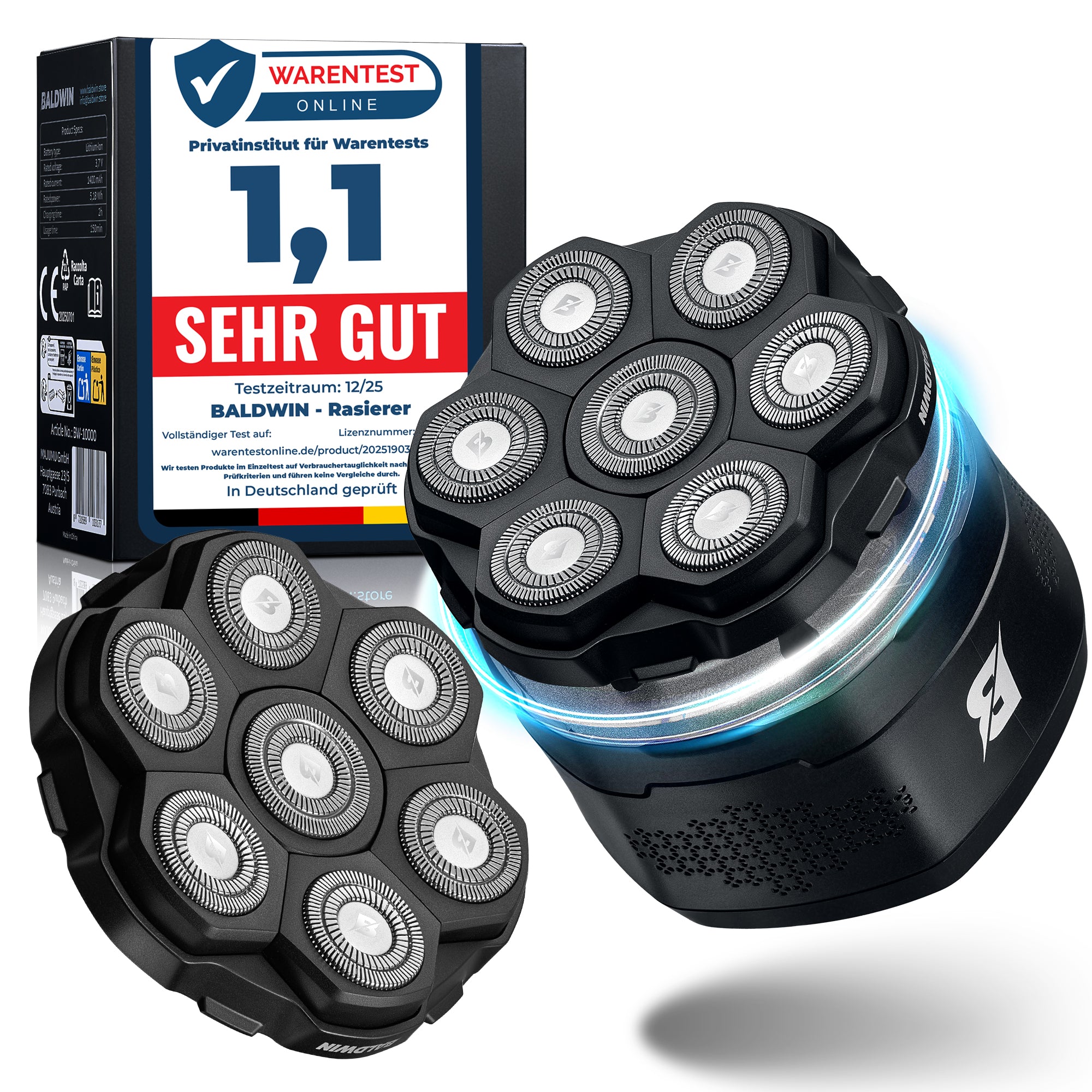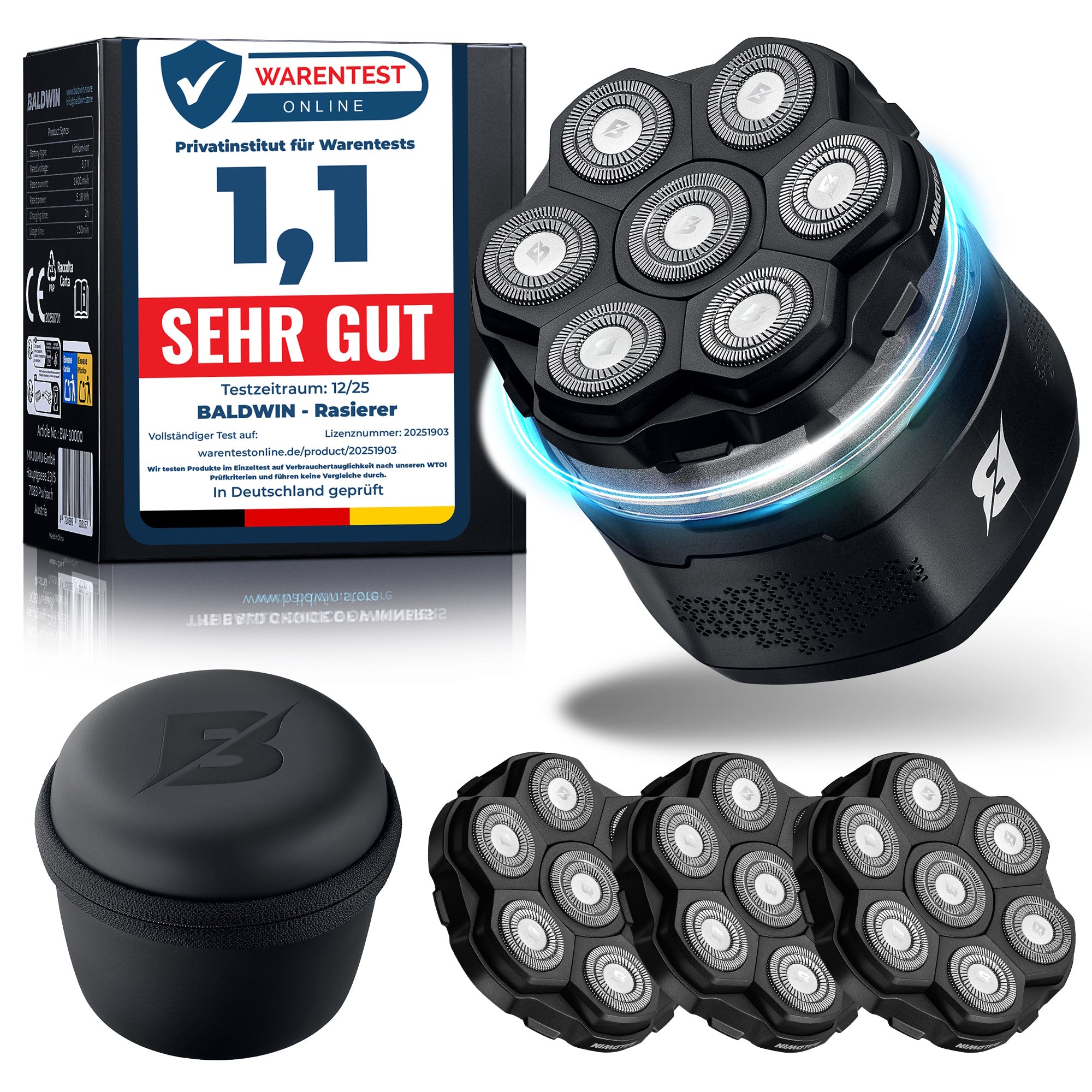 Der BALDWIN Rasierer wurde speziell für eine gründliche, hautnahe Kopfrasur entwickelt – ganz ohne Ziepen, Reizungen oder Nacharbeiten. Mit 7 beweglichen Edelstahlklingen, ergonomischem Design und leistungsstarkem Akku bietet er dir eine Rasurroutine, die sich wie Pflege anfühlt. Ob trocken, nass oder unter der Dusche – BALDWIN liefert ein glattes, sauberes Ergebnis. Ideal für Kings, die wissen, was sie wollen.